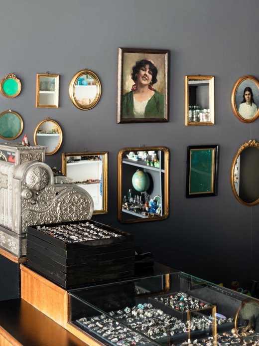 Es grenzt an ein Wunder, dass diese Schmuckstücke überlebt haben, fünfzig, hundert, hundertfünfzig Jahre: Ohrringe, Ketten, Broschen und Armbänder, Kleiderclips, Manschettenknöpfe, von Hand gemacht – und von Hand zu Hand weitergegeben. Geschnitztes findet sich neben Geschliffenem und Gegossenem, versteinertes Holz neben Silber, Glas, Strass, Bakelit, Bernstein, Korallen, Perlmutt. Vieles grenzt hier auf diesen wenigen Quadratmetern an ein Wunder. Wer den Laden betritt, den Blick über die Exponate schweifen lässt und eines in die eigene Hand nimmt, beginnt eine Reise, durch Sehnsüchte, Fantasien, Bilder, gelebte und mögliche Leben.