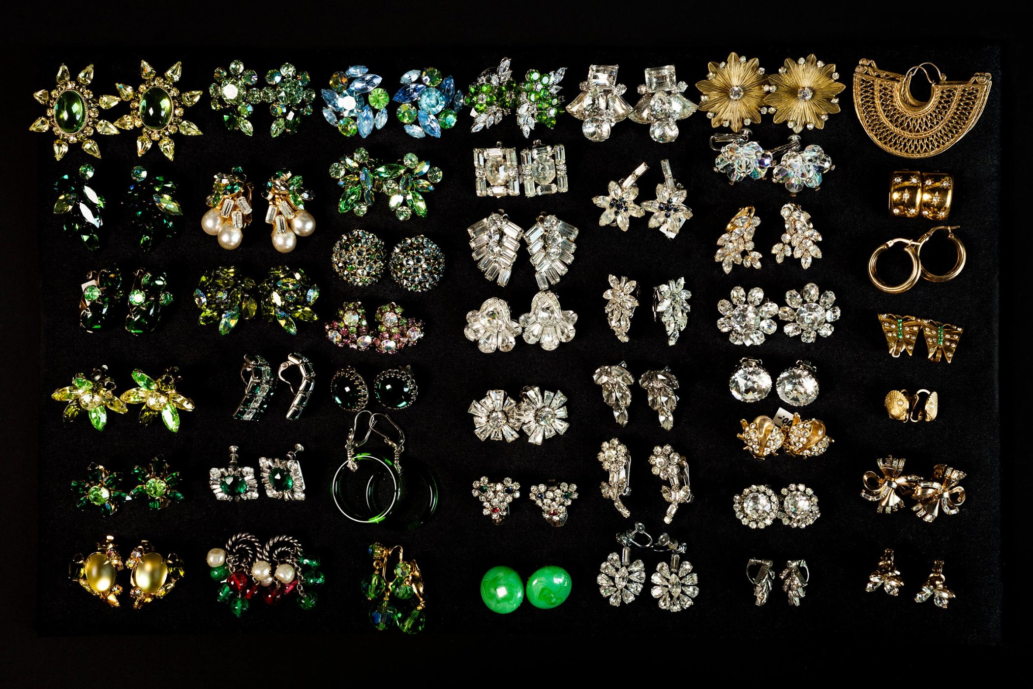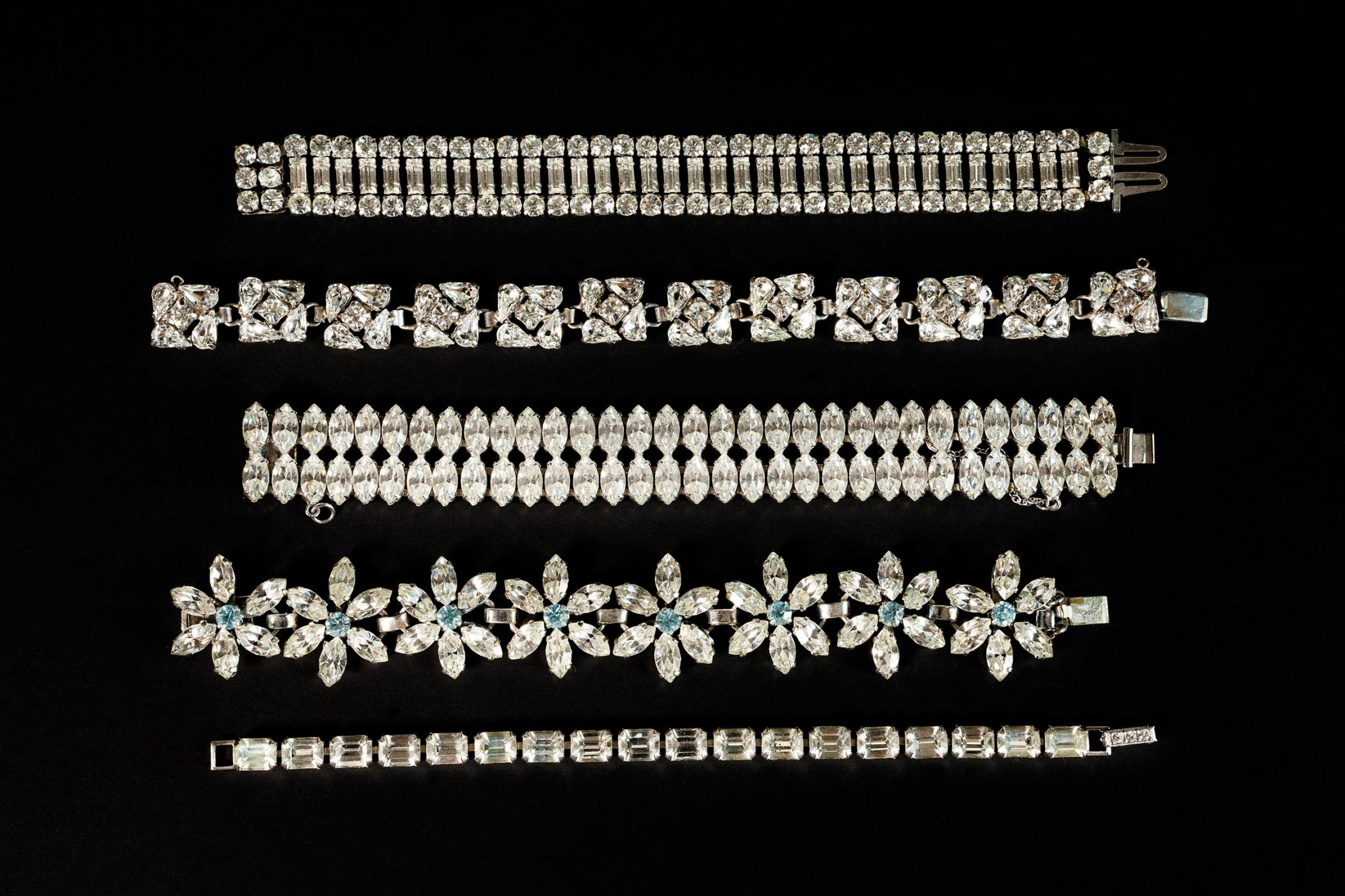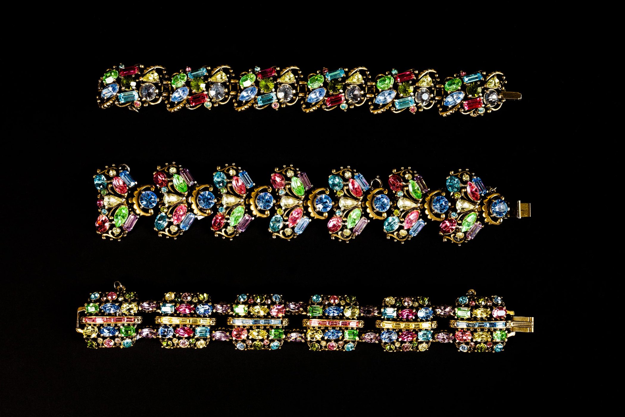 Jedes der hier versammelten Einzelstücke (darunter Regency, Hollycraft, Miriam Haskell, Joseff of Hollywood) erzählt eine Geschichte: von den glamourösen Anfängen Hollywoods, von den Rollen der Frau, von Aufbruch, Emanzipation und Befreiungsschlägen, von Wirtschaftskrisen, Materialknappheit. Sie erzählen von technischen und ästhetischen Innovationen. Von erträumten Kronjuwelen und ersehnten Schatzkammern.