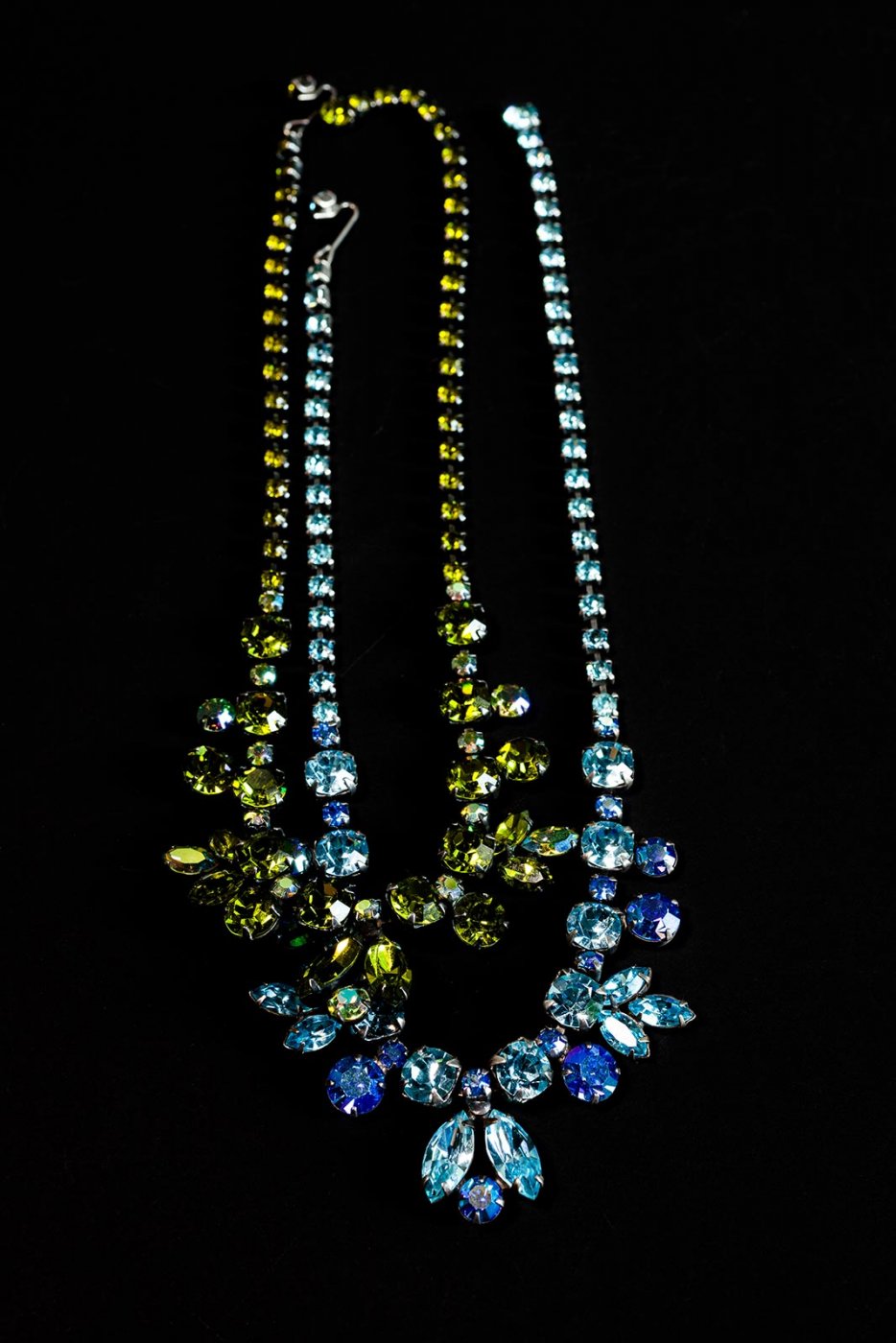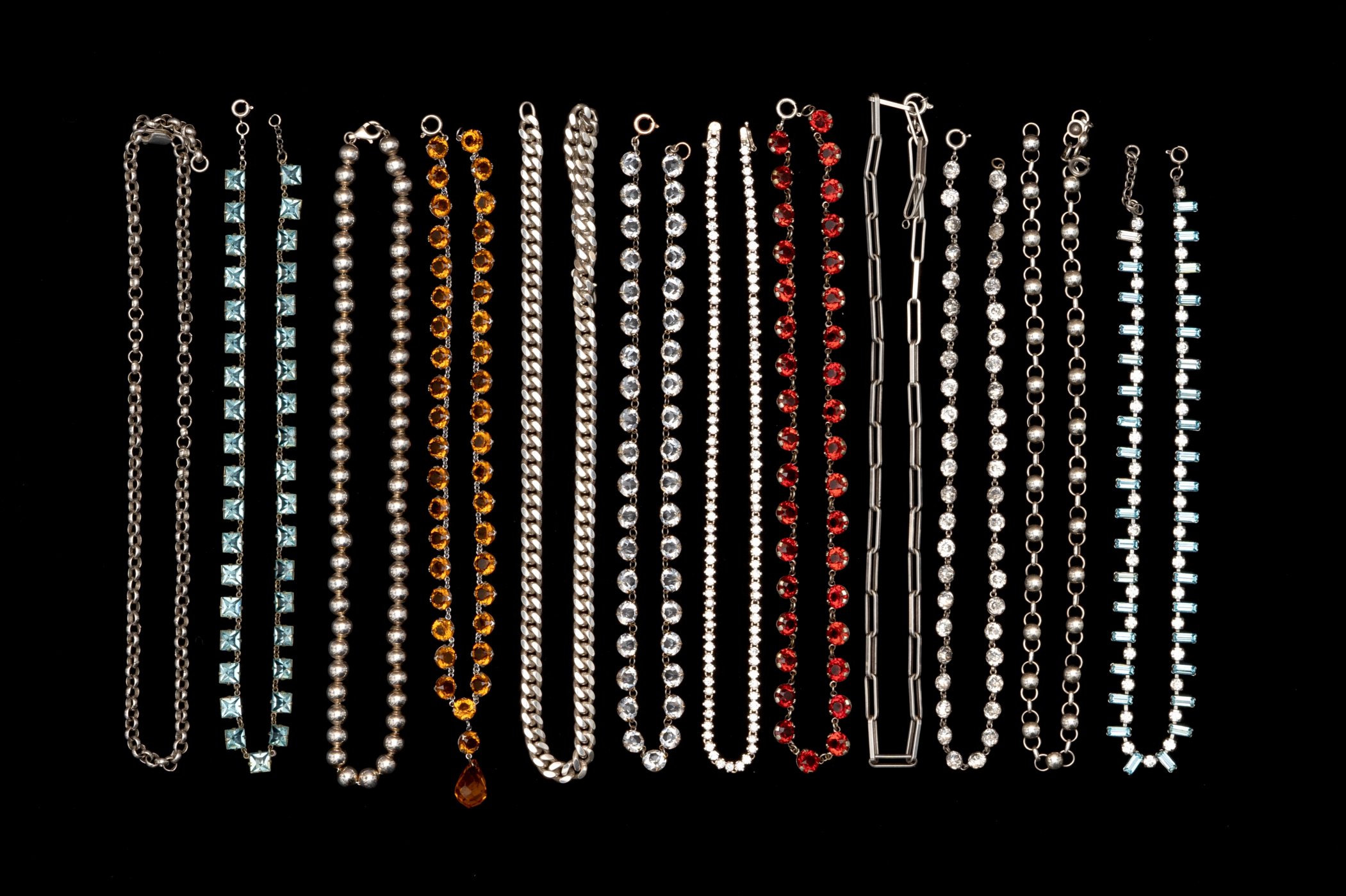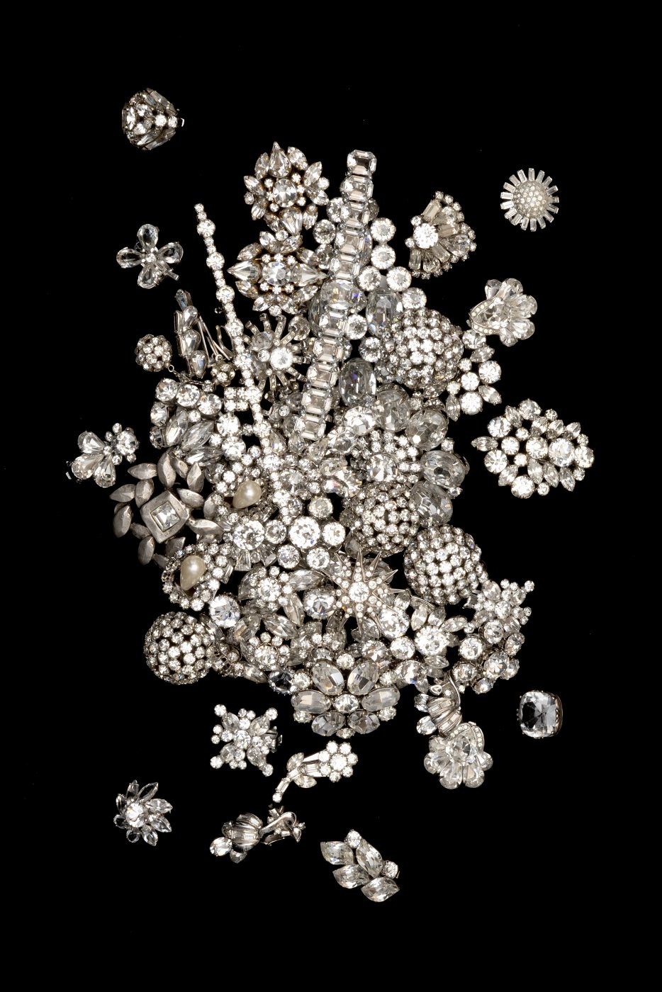 Jedes der hier versammelten Einzelstücke (darunter Regency, Hollycraft, Miriam Haskell, Joseff of Hollywood) erzählt eine Geschichte: von den glamourösen Anfängen Hollywoods, von den Rollen der Frau, von Aufbruch, Emanzipation und Befreiungsschlägen, von Wirtschaftskrisen, Materialknappheit. Sie erzählen von technischen und ästhetischen Innovationen. Von erträumten Kronjuwelen und ersehnten Schatzkammern.